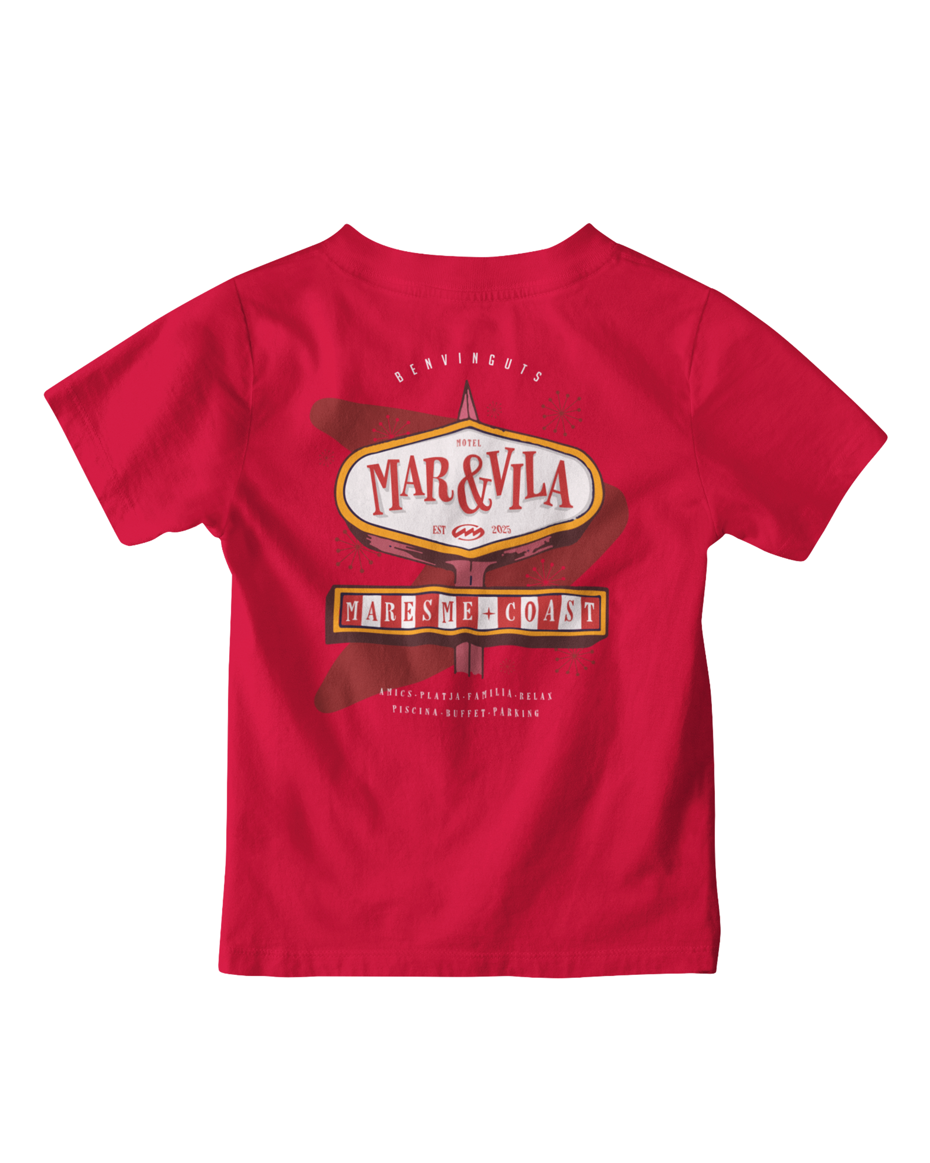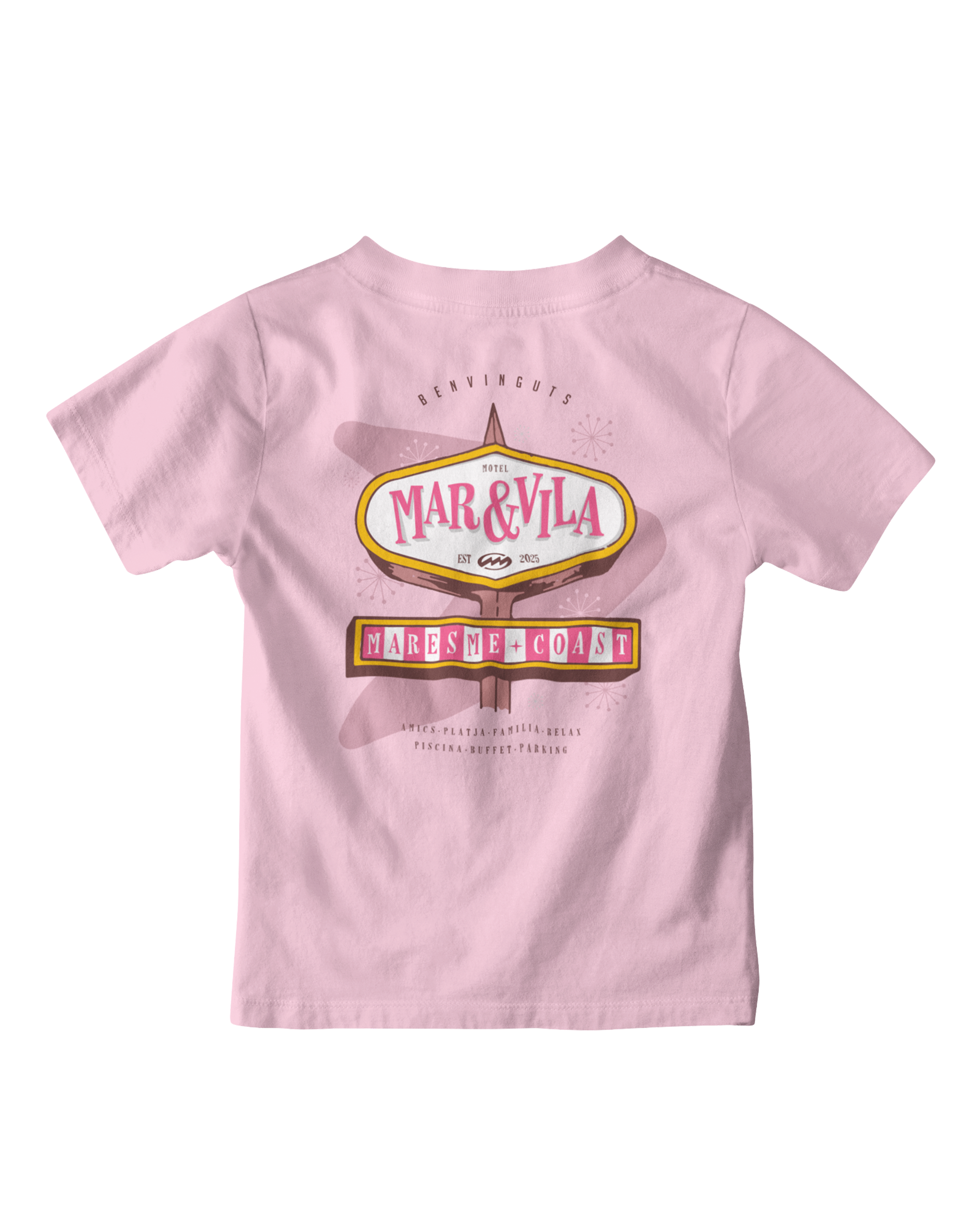 Con un diseño trasero que imita un luminoso de motel vintage y el logotipo Mar&Vila Maresme Coast, esta camiseta invita a soñar con tardes de piscina, helados, chiringuitos y olas perfectas.